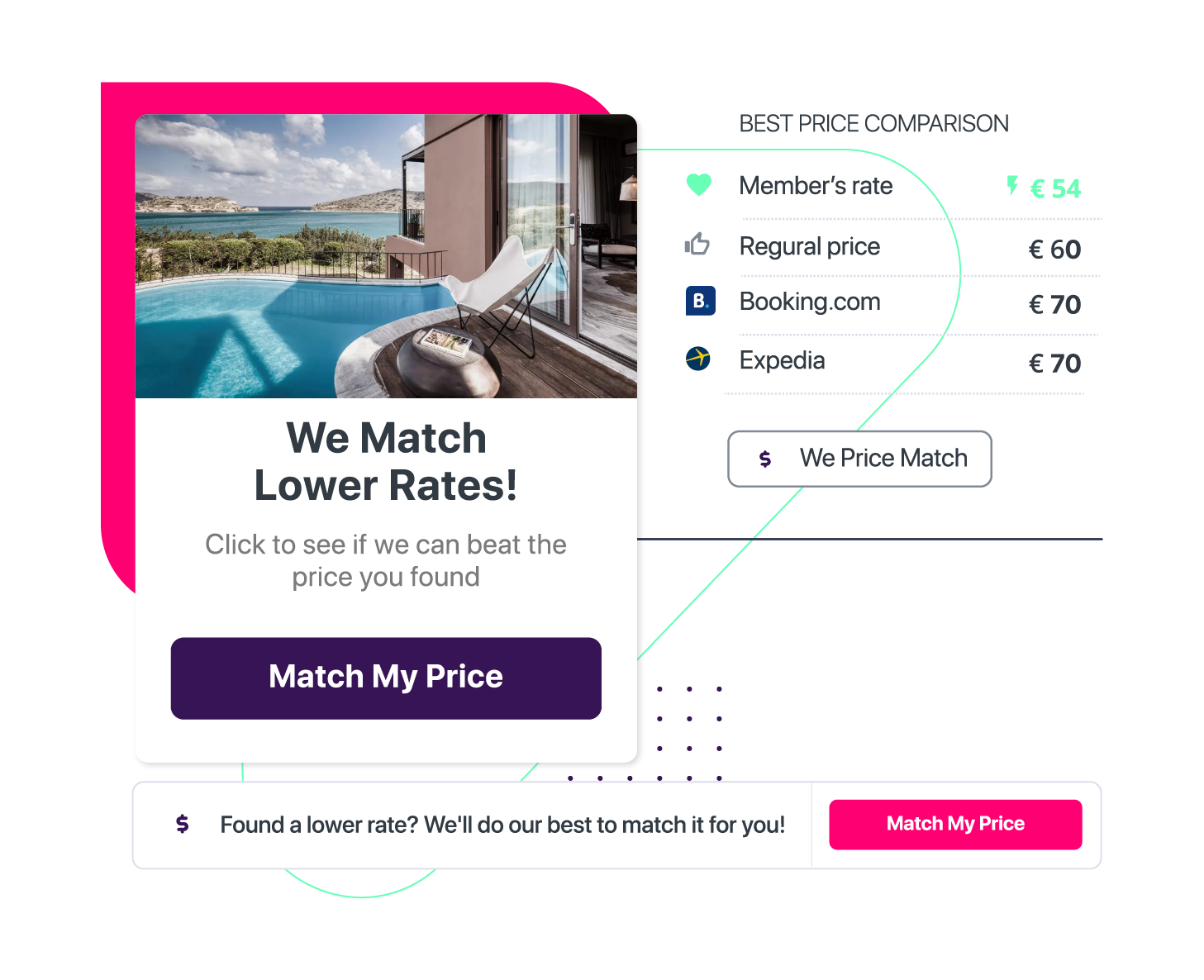 Convierte a los usuarios que comparan precios en reservas directas con Rate Match. Iguala al instante las tarifas aprobadas de las OTAs en tu sitio, aplica cupones automáticamente y aumenta las conversiones sin cambiar tu estrategia de ingresos.